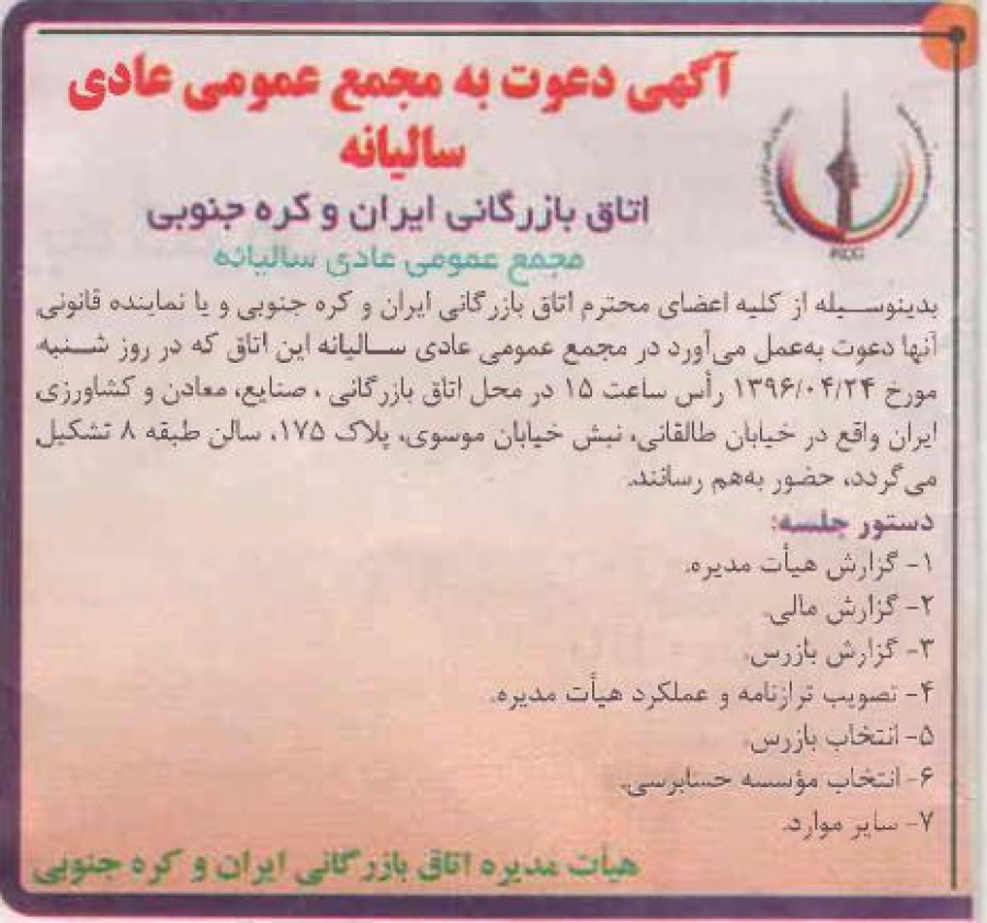 در مجمع عمومی عادی سالیانه این اتاق که در روز شنبه مورخ 1396/4/24 رأس ساعت 15 در محل اتاق بازرگانی، صنایع، معادن و کشاورزی ایران واقع در خیابان طالقانی، نبش خیابان موسوی، پلاک 175، سالن طبقه 8 تشکیل می گردد، حضور به هم رسانند.