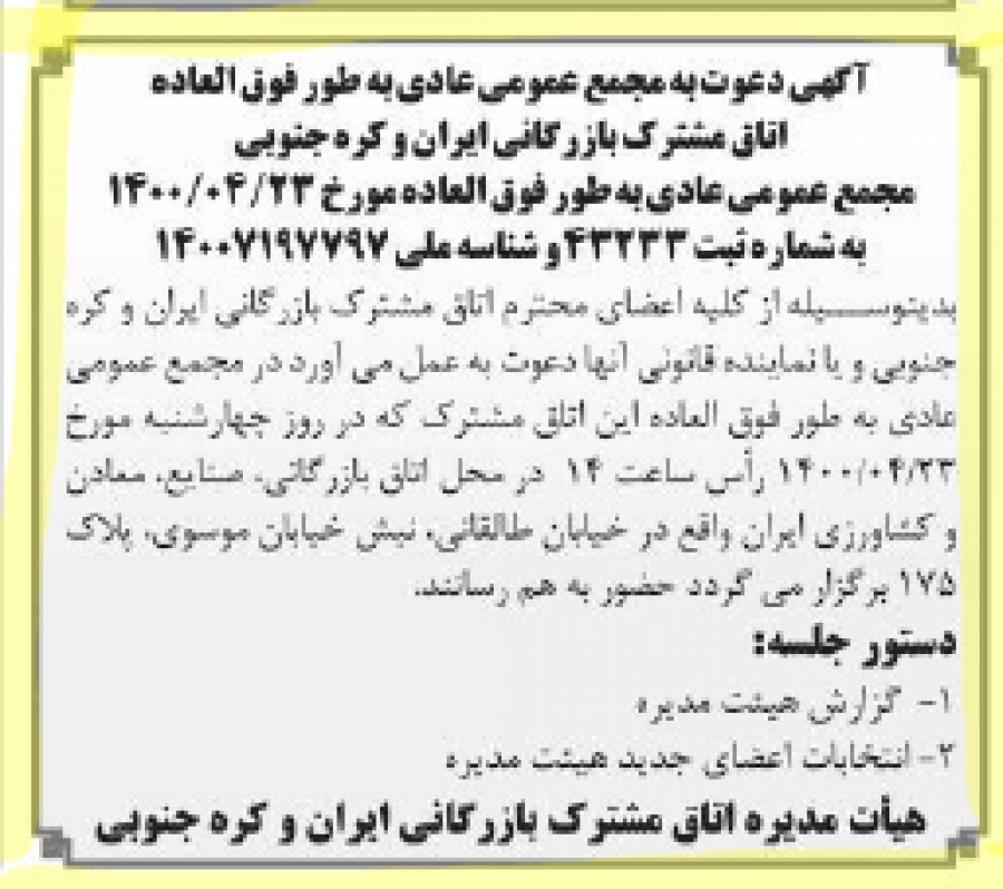 (موجود بر روی سایت اتاق) در انتخابات هیئت مدیره این اتاق دارند، دعوت می شود حداکثر تا پایان وقت اداری روز دو شنبه مورخ 13/04/1400 فرصت دارند نسبت به ارسال مکتوب تقاضای کاندیداتوری خود به دبیرخانه این اتاق از طریق شماره تماس های 86072675-021 یا 86072679-021 اطلاعرسانی فرمایند.