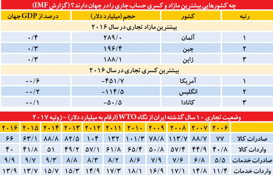 «صندوق بین‌المللی پول» در جدیدترین گزارشی که با عنوان «گزارش بخش خارجی 2017» منتشر کرده درخصوص سیاست‌های حمایت‌گرایانه تجاری و برهم خوردن توازن تجارت جهانی هشدار داده است. به گزارش این نهاد، مسوول اصلی برهم خوردن توازن در اقتصاد جهانی، اقتصادهای پیشرفته هستند. از آنجا که وضعیت کسری تجاری آمریکا، یکی از نگرانی‌های اصلی ترامپ است، برخی کارشناسان بر این عقیده‌اند که هشدار «صندوق بین‌المللی پول» درخصوص برهم خوردن‌توازن تجارت جهان تحت تأثیر فشارهای دولت آمریکا بوده است. اما این صندوق درخصوص سیاست‌های حمایت‌گرایانه دولت ترامپ نیز هشدار داده است و مدعی شده که وضع یا افزایش تعرفه‌های تجاری نه تنها به بهبود تراز تجاری آمریکا کمک نمی‌کند بلکه اثرات ناگواری بر اقتصاد آمریکا و جهان خواهد گذاشت. براساس گزارش «صندوق بین‌المللی پول»، آلمانی‌ها توانستند با پشت سرگذاشتن چین، در صدر اقتصادهایی که بالاترین مازاد تجاری را دارا هستند قرار گیرند.