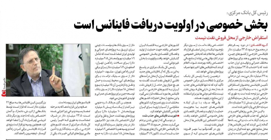 رئیس کل بانک مرکزی در پاسخ به این سؤال که آیا فاینانس‌های جدید برای اقتصاد ایران، از محل درآمدهای ناشی از فروش نفت است، گفت: به هیچ عنوان پول حاصل از فروش نفت ایران به کشورهای خارجی، در این فاینانس‌ها مورد استفاده قرار نمی‌گیرد و این منابع، از محل اعتبارات کشورهای مختلف است. وی تصریح کرد: کشورهای متفاوتی از آسیا و اروپا، برای ایران فاینانس گشایش خواهند کرد.