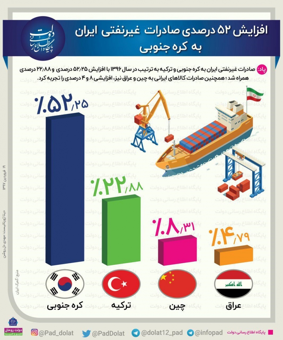 صادرات غیرنفتی ایران به کره جنوبی و ترکیه به ترتیب در سال ۱۳۹۶ با افزایش ۵۲.۲۵ درصدی و ۲۸.۸۸ درصدی همراه شد؛ همچنین صاردات کالاهای ایرانی به چین و عراق نیز، افزایشی ۸ و ۴ درصدی را تجربه کرد.