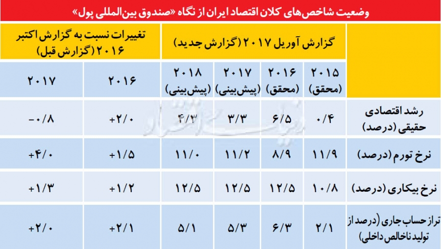 «صندوق بینالمللی پول» در گزارش «چشمانداز اقتصادی جهان» ماه آوریل خود وضعیت شاخصهای کلان اقتصادی را به تفکیک کشورها ارائه کرده و در این میان آمارهای مربوط به اقتصاد ایران نیز ارائه شده است. در آخرین گزارش «چشمانداز اقتصادی جهان» این نهاد که مربوط به اکتبر 2016 است پیشبینی شده بود پس از یک سال رشد ناامیدکننده 4/ 0 درصدی که در سال 2015 محقق شد، رشد اقتصادی کشور (برمبنای تولید ناخالص داخلی حقیقی) در سالهای 2016 و 2017 به ترتیب به 5/ 4 و 1/ 4 درصد میرسد. اما این نهاد در گزارش جدید خود مدعی شده است که نرخ رشد اقتصادی محقق شده در سال 2016 به 5/ 6 درصد رسیده است (2 درصد بالاتر از مقدار پیشبینی شده)، رشدی که بعد از رشد اقتصادی کشور عراق که 1/ 10 درصد است، بیشترین مقدار در منطقه خاورمیانه و شمال آفریقا محسوب میشود. البته این صندوق پیشبینی خود از رشد اقتصادی ایران در سال 2017 را کاهشی کرده است. بر این اساس پیشبینی میشود رشد اقتصادی حقیقی ایران در سالهای 2017 و 2018 به ترتیب به 3/ 3 و 3/ 4 درصد برسد. همچنین بر اساس چشمانداز بلندمدت ارائه شده، ایران در سال 2022 رشد اقتصادی 4/ 4 درصدی را تجربه خواهد کرد. در این رابطه ذکر این نکته ضروری است که در میان کشورهای منطقه، ایران از جایگاه اقتصادی بهتری برخوردار است. بر اساس نسخه بهروزرسانی شدهای که این نهاد در 16 ژانویه امسال منتشر کرد و در آن در منطقه خاورمیانه تنها چشمانداز رشد اقتصادی عربستان سعودی را تغییر داد، پیشبینی رشد اقتصادی عربستان با کاهشی چشمگیر، 4/ 0 درصد اعلام شد. اما در گزارش جدید صندوق مجددا پیشبینی رشد اقتصادی عربستان سعودی کاهش یافته و برای سال 2018 پیشبینی نرخ رشد اقتصادی این کشور از 3/ 2 به 3/ 1 درصد رسیده است. همچنین رشد اقتصادی تحققیافته منطقه خاورمیانه و شمال آفریقا در سال 2016 نرخ 9/ 3 درصد اعلام شد و پیشبینی میشود رشد اقتصادی این منطقه در سالهای 2017 و 2018 به ترتیب به 6/ 2 و 4/ 3 درصد برسد.